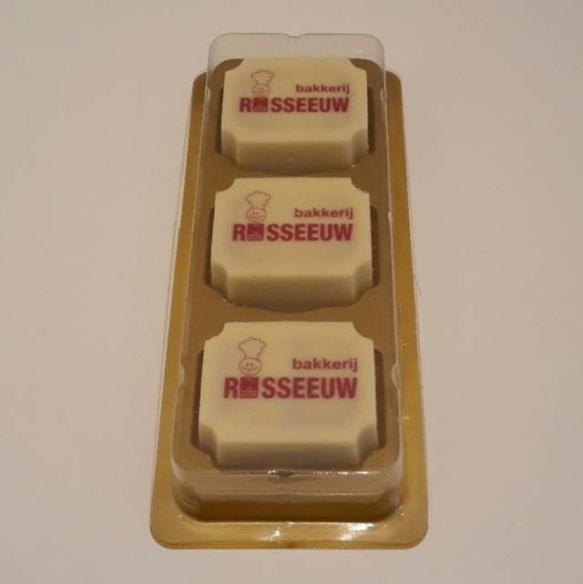 Heerlijke bonbons met een eigen logo of naam in een mooi doosje! De logo bonbons worden per drie verpakt in een goud blisterdoosje met een transparante deksel. De logo bonbons zijn gemaakt van witte chocolade en hebben een logo rechtstreeks op de chocolade bedrukt. Afm. bonbon 35x28x14 mm. Ook zijn er blisterdoosjes voor 1, 2, 4 of 6 bonbons. Ook is het mogelijk om 3 verschillende afbeeldingen per doosje te bestellen. Minimale bestel hoeveelheid per soort is 15 stuks.
