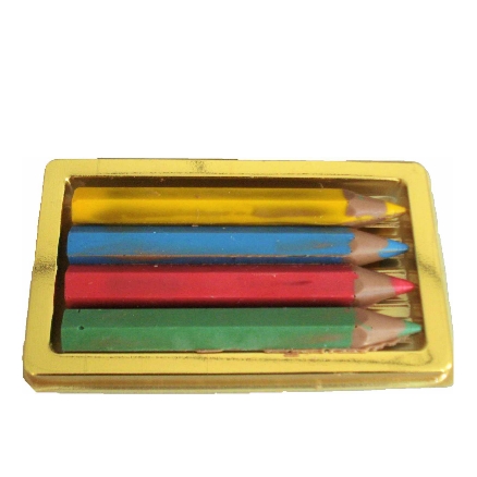 Leuk kadootje voor de meester of juf, deze vier vrolijk gekleurde potloden van chocolade! Afmeting: 7x11 cm