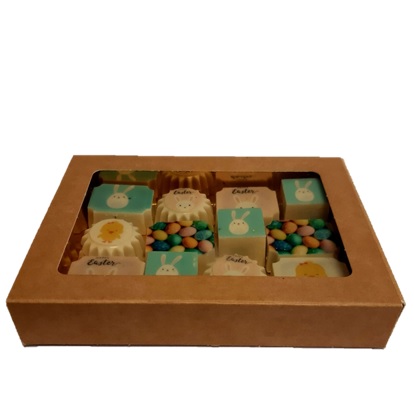 Luxe vensterdoosje gevuld met paasbonbons en chocolaatjes. Afmeting doosje 15x11 cm.