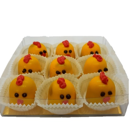 Doosje gevuld met 9 schattige paaskuikentjes van chocolade met een vulling van hazelnoot praliné.