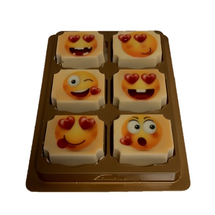 Doosje met 6 Valentijn smiley bonbons. Gevuld met hazelnootpraliné.
