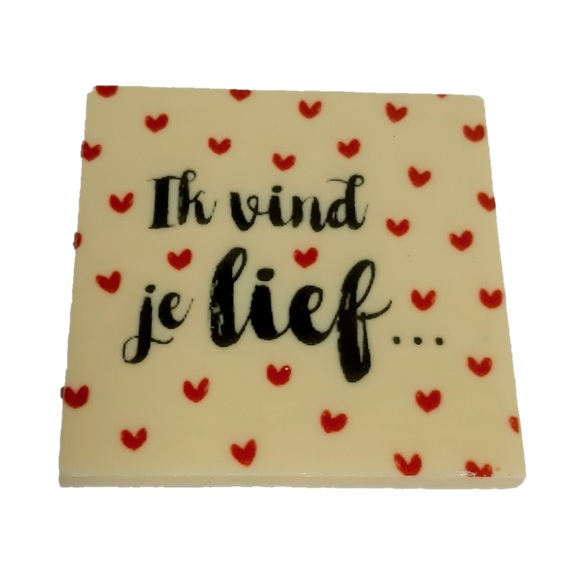 Plak van witte chocolade met tekst 'ik vind je lief'. Kan ook met eigen foto of tekst! afmeting 8,5 x 8,5 cm.