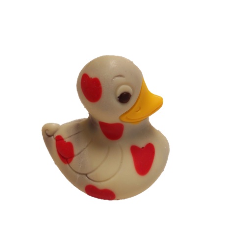 Klein chocolade badeendje (hoogte 7 cm) met hartjes
