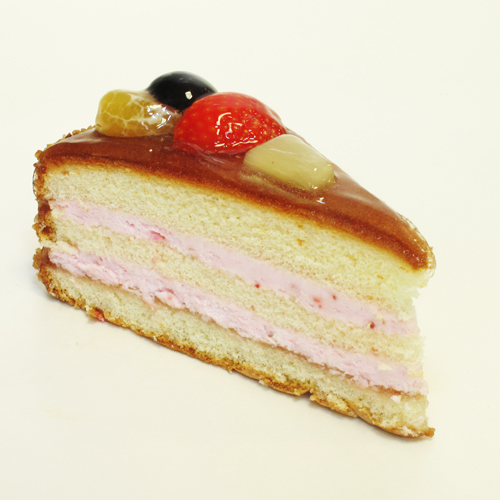 Gebakspunt van biscuit gevuld met aardbeienjam en aardbeienbavarois. Gedecoreerd met diverse soorten fruit afhankelijk van het seizoen.