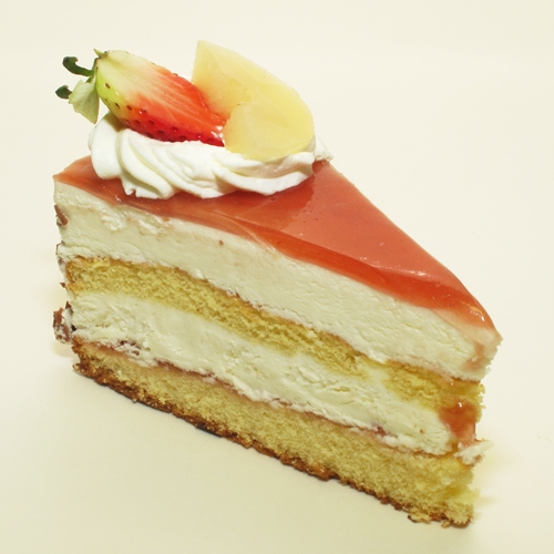 Gebakspunt van heerlijk frisse kwarkbavarois met laagjes biscuit, afgewerkt met aardbeienjam en toefje slagroom met stukje fruit.