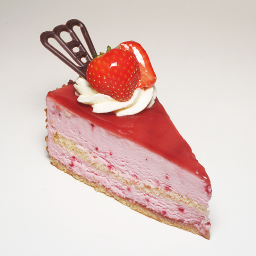 Gebakspunt van heerlijke bavarois van zomerse aardbeien met laagjes biscuit, afgewerkt met aardbeienjam en toefje slagroom.
