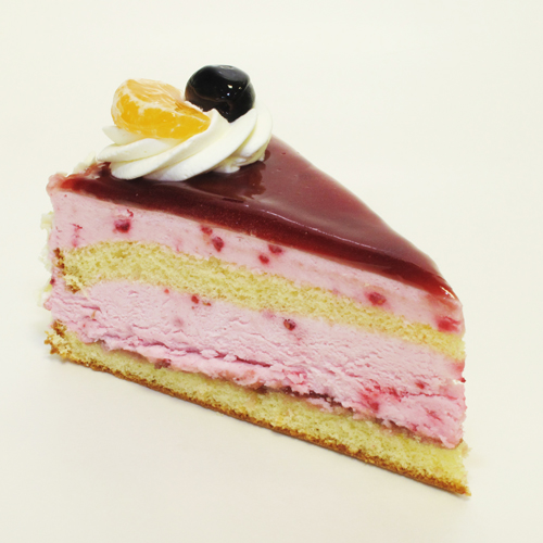 Proef de zomer in deze gebakspunt van bavarois met frambozensmaak en laagjes biscuit, afgewerkt met frambozenjam en toefje slagroom.