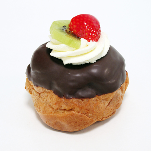Een roomboter soes gevuld met romige slagroom. De moorkop is geglaceerd met chocolade en afgewerkt met een toef slagroom en fruit.