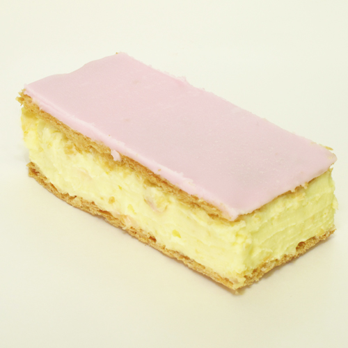 Krokante roomboterplakken gevuld met Zwitsere room en geglaceerd met roze fondant.