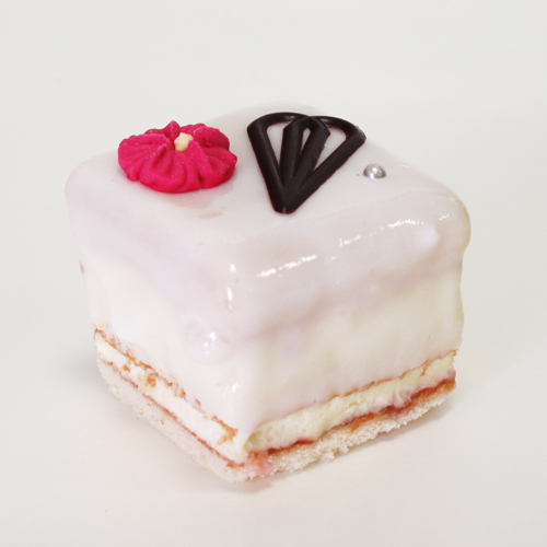Een petit four, een klein gebakje van 5x5 cm wat vaak gebruikt wordt voor een receptie of bijzondere gelegenheid. Deze petit fours zijn van biscuit gevuld met aardbeienjam en slagroom, laagje heerlijke marsepein en gedompeld in een laagje witte chocolade. Afgewerkt met een bloemetje en chocolaatje.