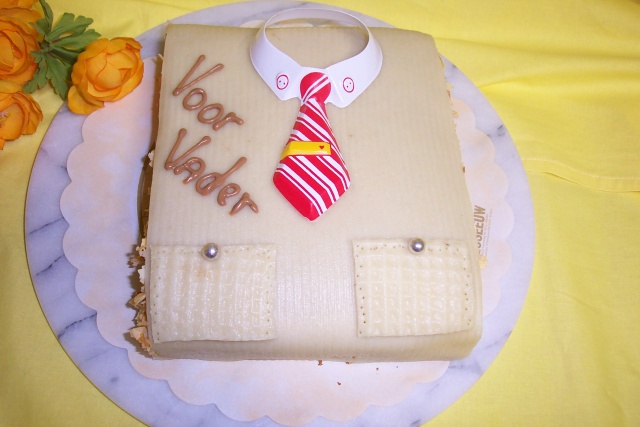Biscuit gevuld met aardbeienjam en slagroom en overtrokken met echte marsepein. De taart wordt afgewerkt als een overhemd en krijgt om het af te maken een plastic stropdas. De tekst 'voor vader' is hier als voorbeeld en wordt niet standaard vermeld. Geschikt voor 8 personen.