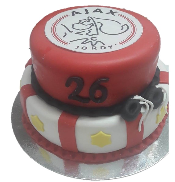 Stapeltaart in thema Ajax geschikt voor ca. 30 personen. De taart wordt standaard gemaakt met icing en u kunt kiezen uit een vulling van vanille crème, aardbeien crème of chocolade crème. Gelieve dit bij de opmerking te vermelden.