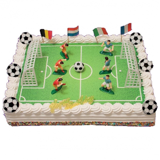 Feestelijke themataart voor echte voetbal fans. Biscuit gevuld met aardbeienjam en slagroom. Voor ca. 20 personen.