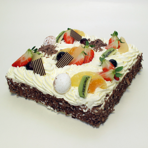 Biscuit gevuld met aardbeienjam en slagroom, gedecoreerd met vruchten en chocolaatjes en aangezet met chocolade. Verkrijgbaar vanaf 8 personen.