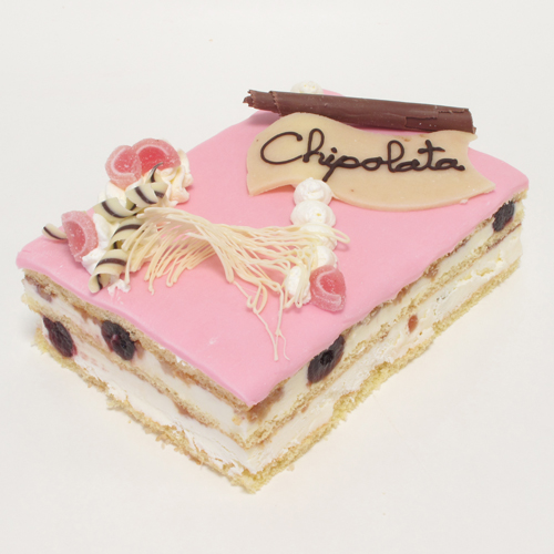 Traditionele taart van biscuit, gevuld met amarenen kersen en bitterkoekjes in een romige bavarois. Overtrokken met marsepein en fondant. Afgewerkt met slagroom en chocolaatjes. Geschikt voor ca. 6 personen.