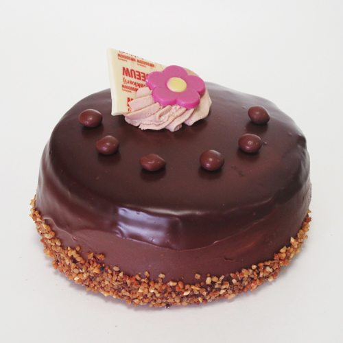 Heerlijke chocoladebiscuit met gemalen hazelnoten, gevuld met frambozenmoes en chocoladebavarois. Overgoten met chocoladeganache en aangezet met nootjes. Afgewerkt met chocoladeslagroom en chocolaatjes.