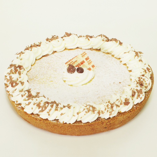 Vlaaibodem van zanddeeg en gele room met een mooi goudbruin gebakken rijstevulling, laagje poedersuiker en slagroom.